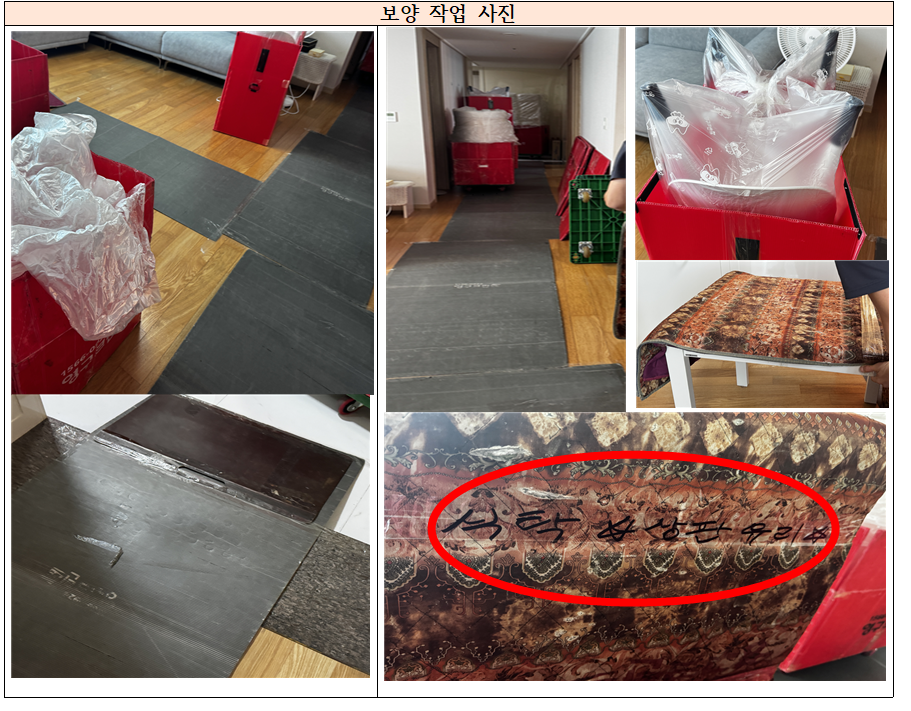 보이시나요? 일부만 사진을 찍었지만 바닥찍힘도 예방하시고, 의자까지 먼지 들어가지 않게 비닐로 로 모두 보양작업을 해주십니다. 더불어 저희 집 식탁은 상판이 유리/대리석으로 되어있는데요!? 이부분을 아주 세심하게 안쪽에 테이핑하시고 상판에 천을 여러겹 씌우고, 매직으로 "식탁 상판 유리" 주의를 써서 절대 깨지지 않게 작업을 해주셨습니다. 정말 세심한 부분이 많이 느껴집니다