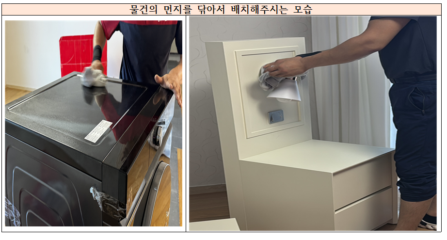 짐을 놓기 전 스팀청소기로 싸악 바닥을 닦아주셨습니다. 저희가 시간이 부족해서 입주청소를 못했는데 그 부분을 아시고 더 열심히 바닥을 닦아주셔서 정말 감사했습니다. 그렇게 한 후 물건을 배치하니 한결 마음이 가벼웠습니다. 또한 저희 집 냉장고 청소를 해주셔서 정말 감사했습니다. 냉장고를 분리할 때 다 깨끗하게 닦아주셔서 냉장고 청소 서비스를 받은 기분이었습니다. 솔직히 냉장고 청소가 너무 어려워서 어떻게 해야할지 늘 걱정이었는데 이사를 통해 냉장고가 더 깨끗해져서 정말 감사했습니다. 더불어서 물건을 배치할 때 먼지를 다 닦아주시면서 배치를 해주셨어요. 제가 미처 평소에 닦지 못했던 부분들을 닦으면서 해주시다니...정말 감동입니다. 더불어서 세탁기 놓는 곳도 물청소로 깨끗하게 청소후 세탁기를 넣어 주셨습니다. 저희도 물건을 넣기 바로 직전, "세탁기 놓을 곳이 더럽네 어떡하지" 이러고 있었는데 빠르게 청소를 해주신 후 물건을 배치해 주셔서 감사했습니다.