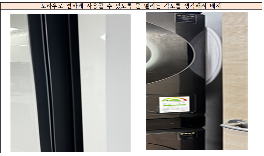 세탁기와 냉장고 등의 가전을 소비자입장에서 잘 배치해주십니다. 집 평수가 줄어서 세탁기 놓는 곳이 부족했는데 문 열리는 각도까지 생각해서 배치를 해주셨습니다. 저희는 이럴 때 어떤 각도가 편한지 모르는데, 405호점은 확실히 노하우가 있으신 것 같아요 사용하기 편한 각도로 배치를 해주십니다. 좁은 공간, 효율적으로 배치해 주셔서 감사해요.