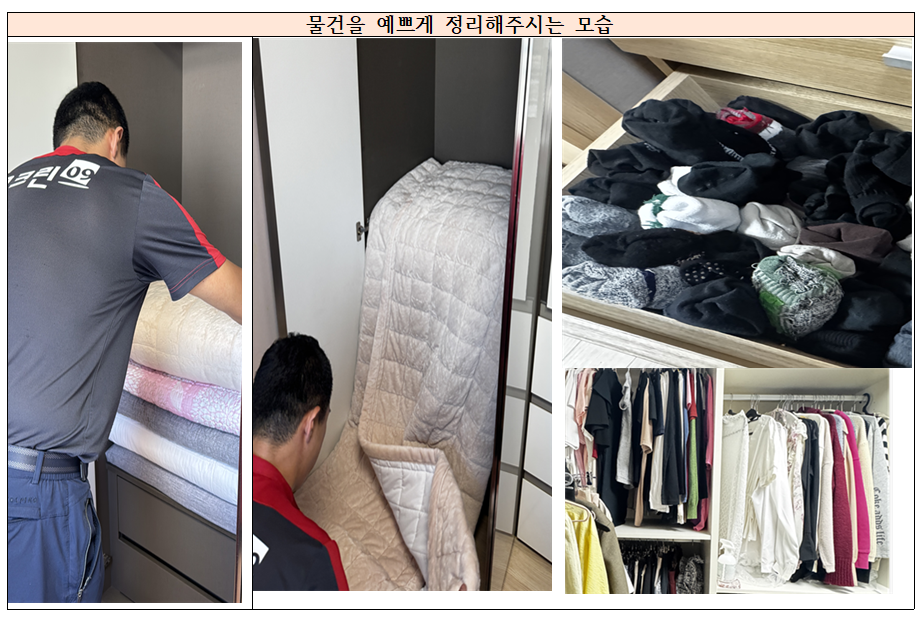 더불어서, 정리정돈!배치!를 정말 잘 해주셔서 깜짝 놀랐습니다. 이불 개서 넣는 법, 속옷정리, 옷정리 스킬이 정말 좋았습니다. 저는 속옷을 개면 그냥 두고 정리를 안했는데;;(뜨끔) 이번에 배치해주실 때 속옷, 옷도 다 예쁘게 정리해주셔서 정말 감사했습니다. 이사를 통해 살림까지 배웠어요! 또 이불도 정말 너무 가지런히 정리해주셨습니다. 어떻게 이렇게 정리를 잘하시죠!?? 짐만 옮겨주시는게 아니라 정리정돈까지 해주셔서 너무 감사했어요!