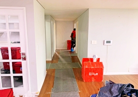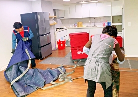 영구크린 전용차량, 유니폼 및 전용자재 사용, 바닥보강재 설치 완료, 아이스박스 청결 양호, 이중비닐 포장 및 에어캡 포장, 가전, 가구 커버포장 진행 등