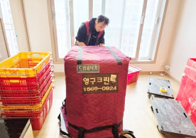 영구크린 전용차량, 유니폼 및 전용자재 사용, 바닥보강재 설치 완료, 아이스박스 청결 양호, 이중비닐 포장 및 에어캡 포장, 가전, 가구 커버포장 진행 등