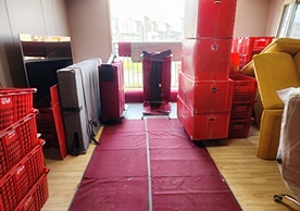 영구크린 전용차량, 유니폼 및 전용자재 사용, 바닥보강재 설치 완료, 아이스박스 청결 양호, 이중비닐 포장 및 에어캡 포장, 가전, 가구 커버포장 진행 등