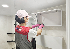 또한 스팀해빙기, 마루세정기 등의 전문 장비를 이용해 꼼꼼하게 청소를 진행하고, 용도별로 정확히 구분한 세제통과 사색타올은 전문적인 청소현장을 보여주기에 부족함이 없었습니다.