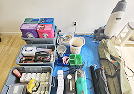 장비와 소모품들을 잘 정리정돈해서 깔끔하게 청소를 진행하는 모습이 보기 좋았습니다.