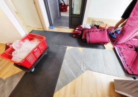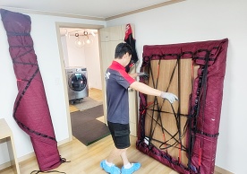 영구크린 전용차량, 유니폼 및 전용자재 사용, 바닥보강재 설치 완료, 아이스박스 청결 양호, 이중비닐 포장 및 에어캡 포장, 가전, 가구 커버포장 진행 등