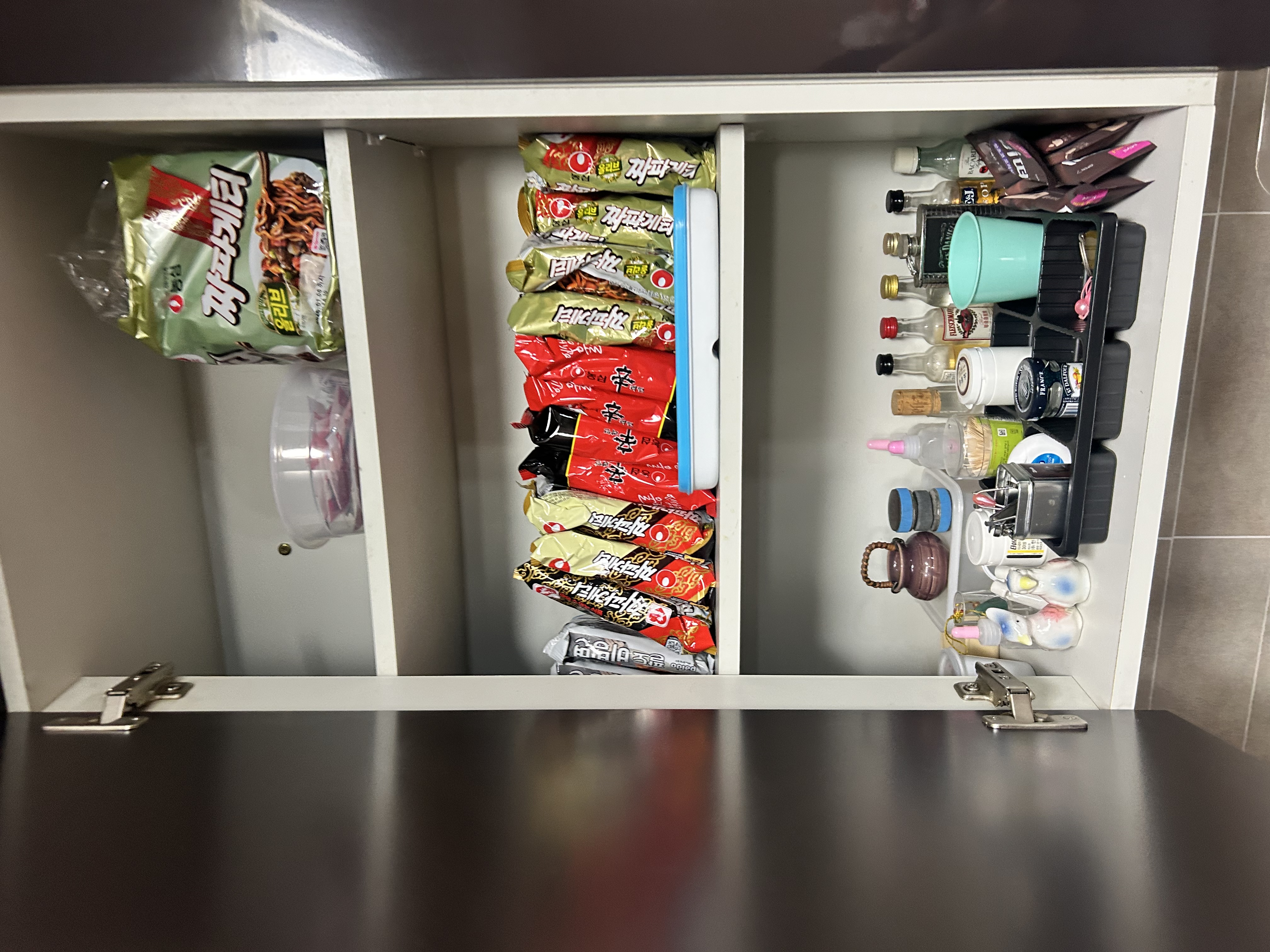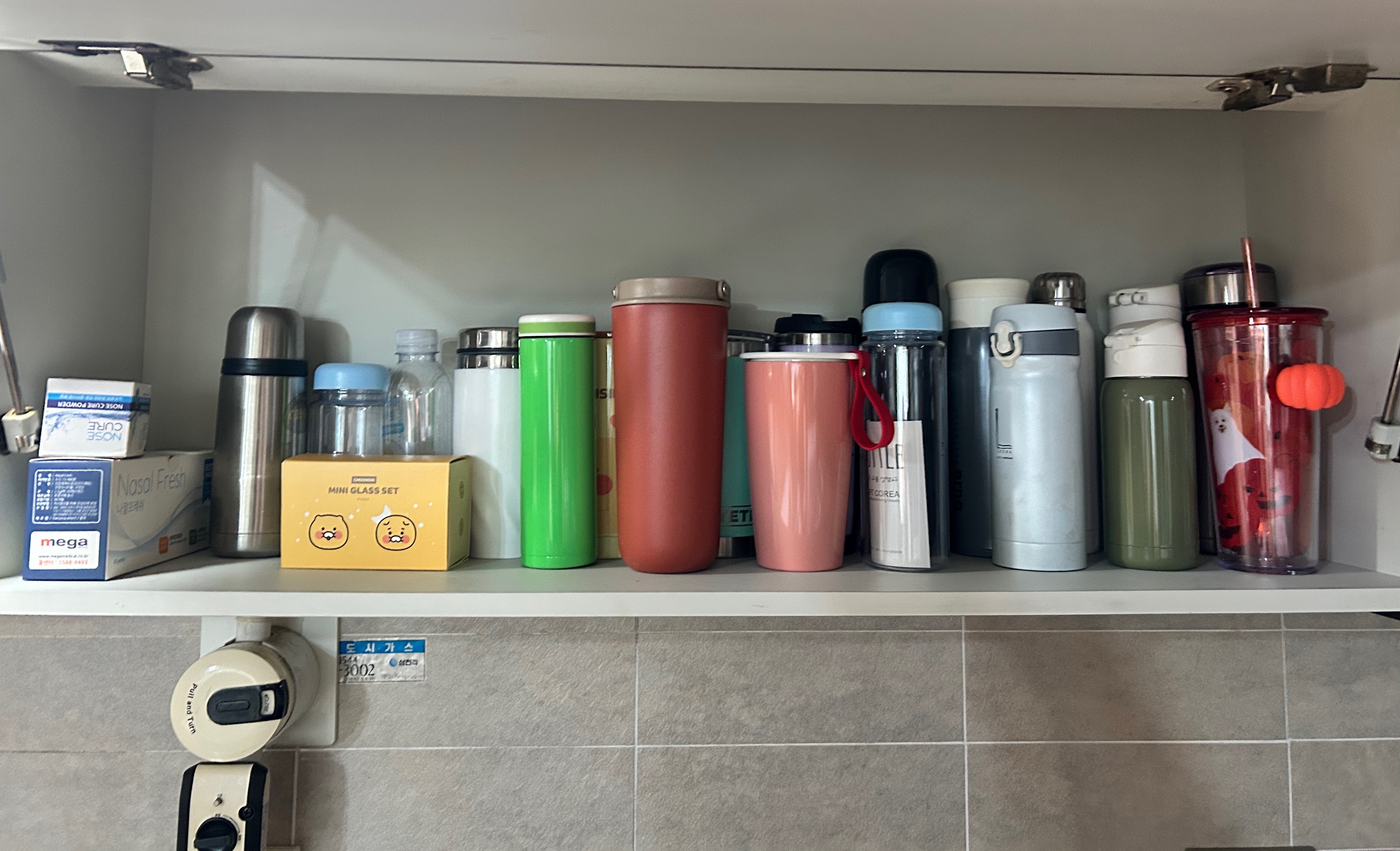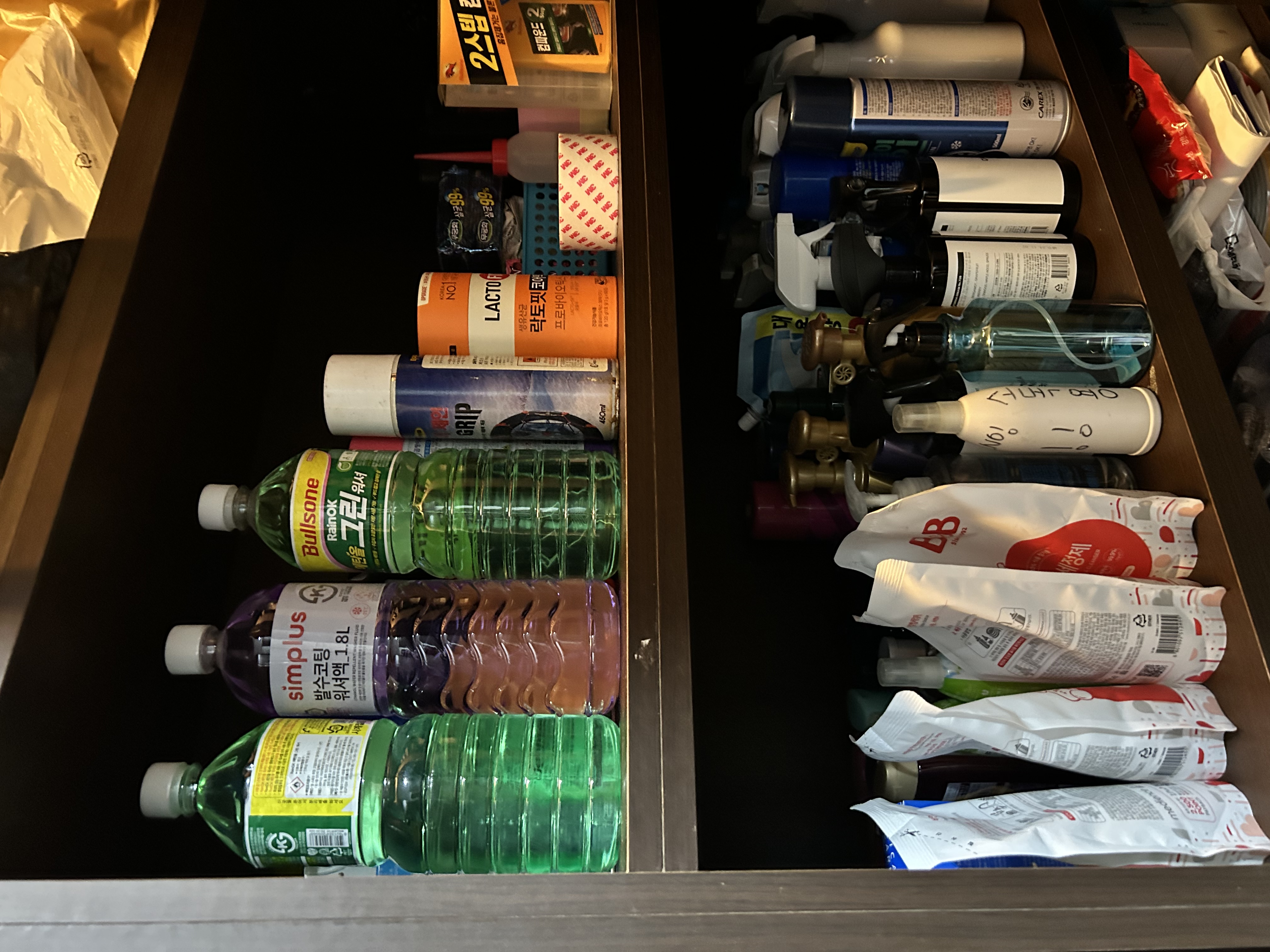 정리에 있어 매트를 깔아 오랜 세월이 지난 후에 생기는 찌든 때나 자국을 방지하기 위한 이모님의 센스 있는 주방 정리 능력
