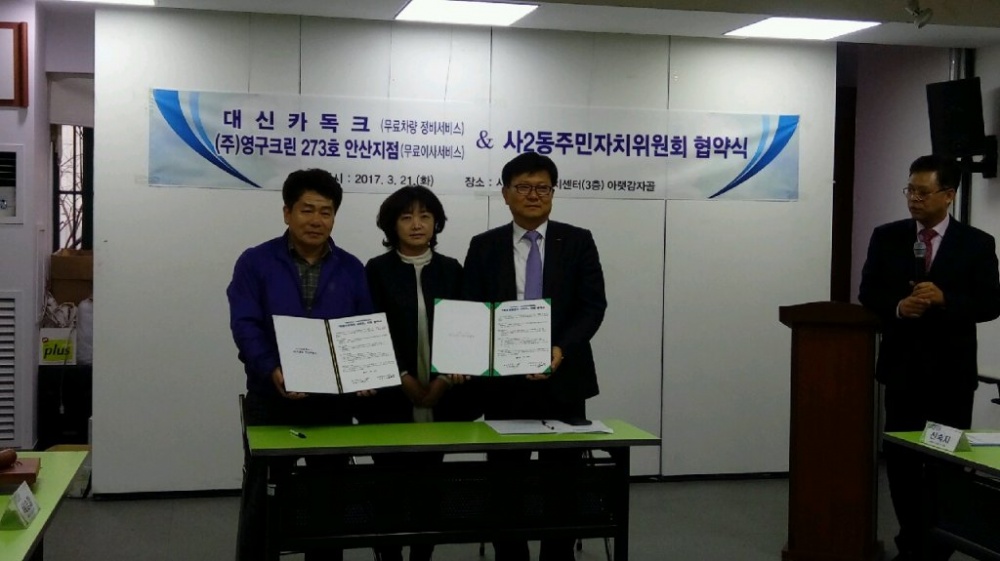 [인천일보] 안산시 상록구 사2동주민자치위원회(위원장 윤영중)는 최근 차량정비공장 대신카독크(대표 이남준), 이사업체 (주)영구크린 273호 안산지점(지점장 김은숙)과 저소득층 대상으로 무료차량정비서비스와 무료이사서비스 지원을 위한 업무협약을 했다고 26일 밝혔다.