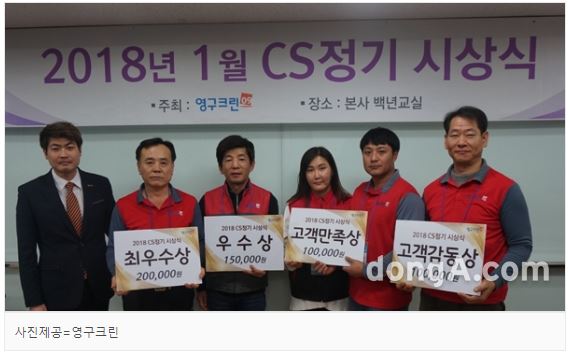 이런 가운데, 영구크린은 지난 17일 강남구 삼성동 본사에서 ‘2018년 1월 CS정기 시상식’을 개최했다. 12월 평가 결과, 최우수상은 안양시 포장이사를 담당하는 196호점이 수상했다. 우수상은 216호점(강남구, 서초구, 송파구, 중랑구, 노원구), 26호점(동작구, 영등포구)이 수상했으며, 고객만족상은 299호점(용인시, 강남구, 서초구, 송파구), 417호점(안양시)이 수상했다. 원룸이사 지역점으로는 304호점과 324호점이 고객감동상을 수상했다. 분기마다 진행되는 지방권역의 우수점으로는 부산시 포장이사를 제공하는 405호점이 최우수상, 126호점이 우수상을 각각 수상했다.
