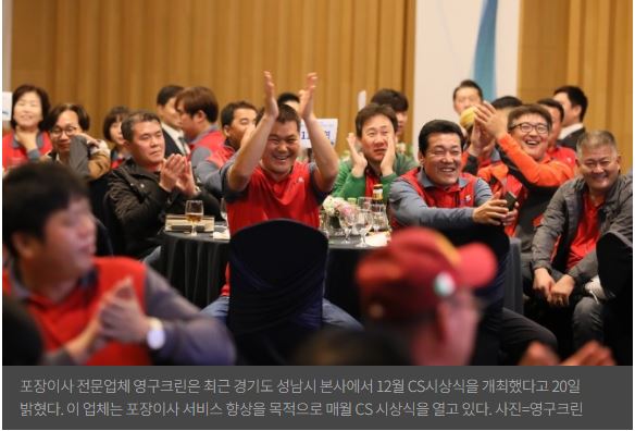 [글로벌이코노믹] - 포장이사 전문업체 영구크린은 최근 경기도 성남시 본사에서 12월 CS시상식을 개최했다고 20일 밝혔다. 이 업체는 포장이사 서비스 향상을 목적으로 매월 CS 시상식을 열고 있다.