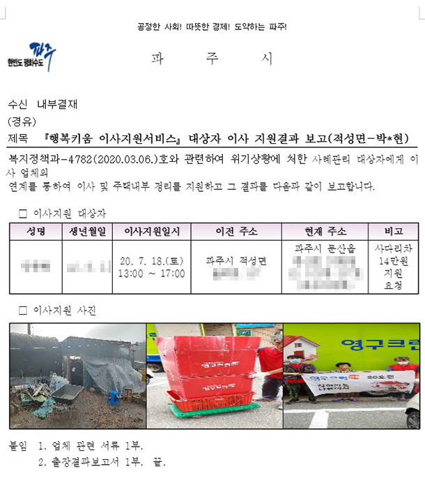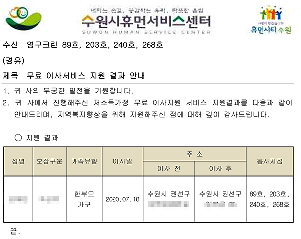 2020년 7월 18일 89호, 203호, 240호, 268호 무료이사지원 서비스
