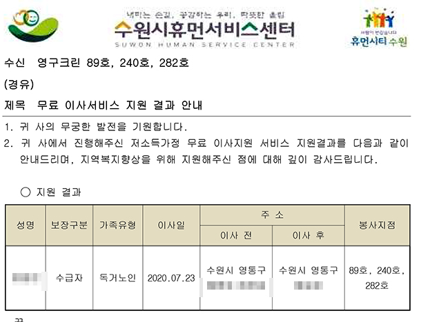 2020년 7월 23일 89호, 240호, 282호 무료이사지원 서비스