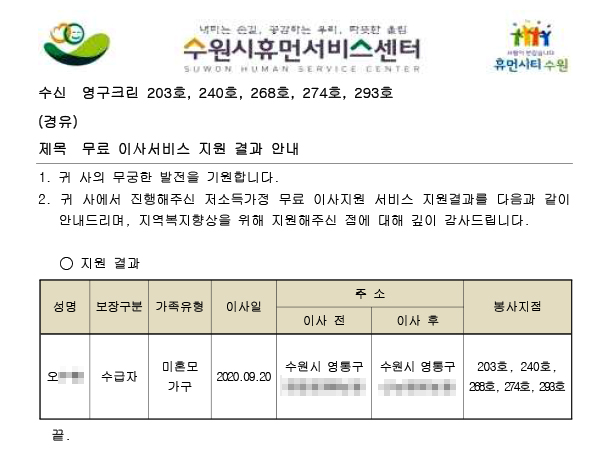 2020년 9월 20일 203호, 240호, 268호, 274호, 293호 무료이사지원서비스
