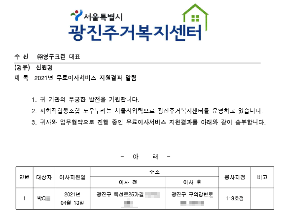 2021년 4월 13일 113호 무료 이사 지원 서비스