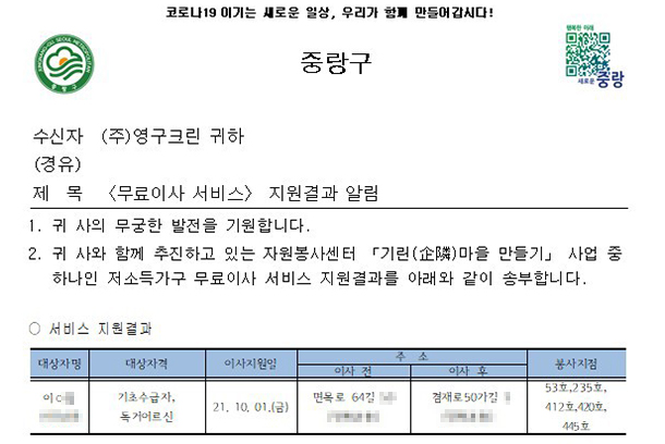 2021년 10월 1일 53호, 235호, 412호, 420호, 445호 무료이사지원