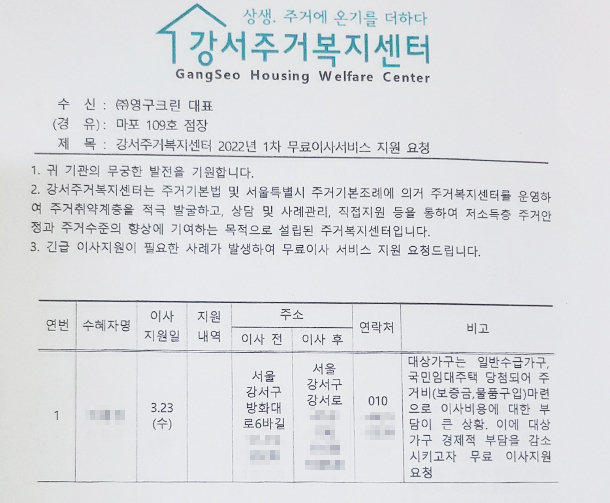 2022년 3월 23일 109호 무료 이사 지원 서비스