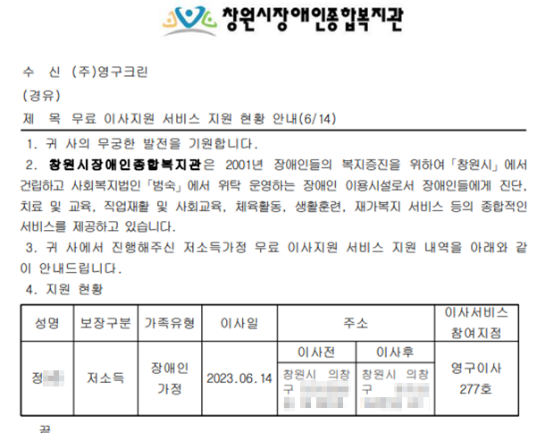 2023년 6월 14일 277호 무료 이사 지원 서비스
