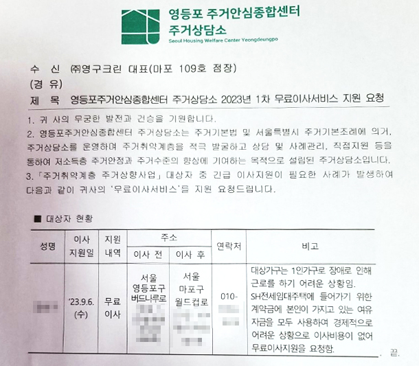 2023년 9월 6일 109호 무료 이사 지원 서비스