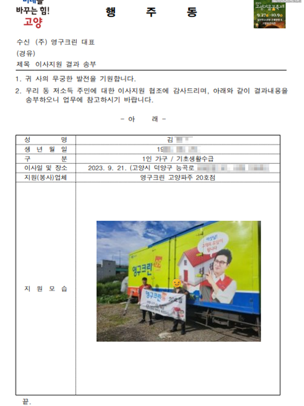 2023년 9월 21일 20호 무료 이사 지원 서비스