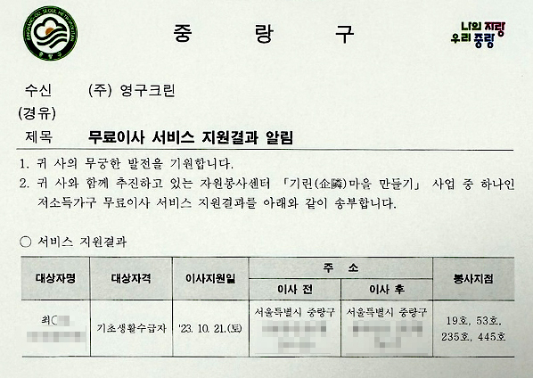 2023년 10월 23일 19호, 53호, 235호, 445호 무료이사지원서비스
