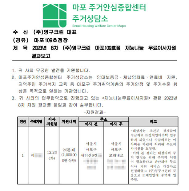 2023년 12월 26일 109호 무료 이사 지원 서비스