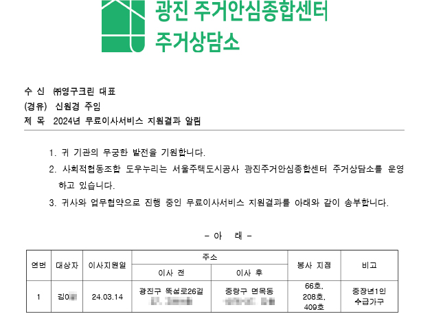 2024년 3월 14일 66호, 208호, 409호 무료이사지원서비스
