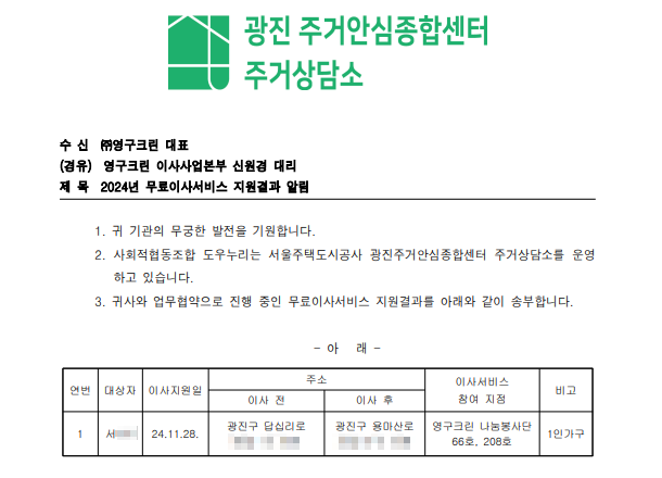 2024년 11월 28일 66호, 208호 무료 이사 지원 서비스
