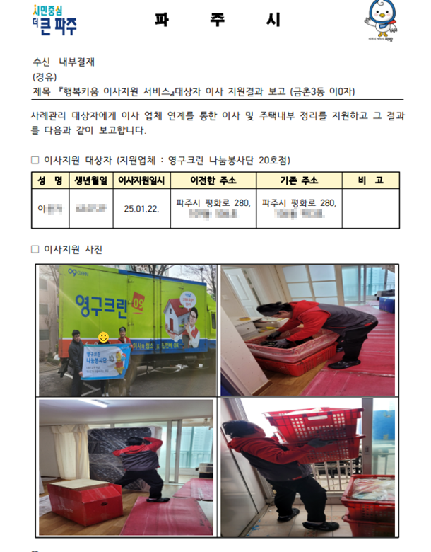 1월 22일 나눔봉사단 20호점 무료 이사 지원 서비스