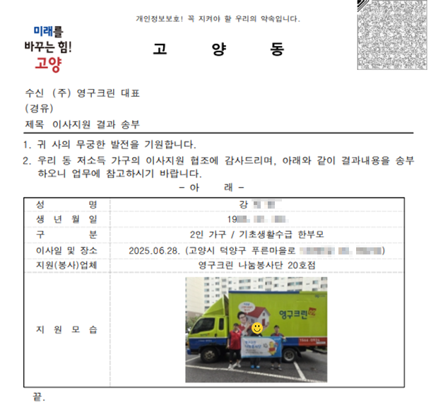 2025년 6월 28일 영구크린 나눔봉사단 20호점 무료 이사 지원 서비스