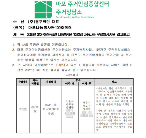 2025년 9월 29일 나눔봉사단 109호 무료 이사 지원 서비스