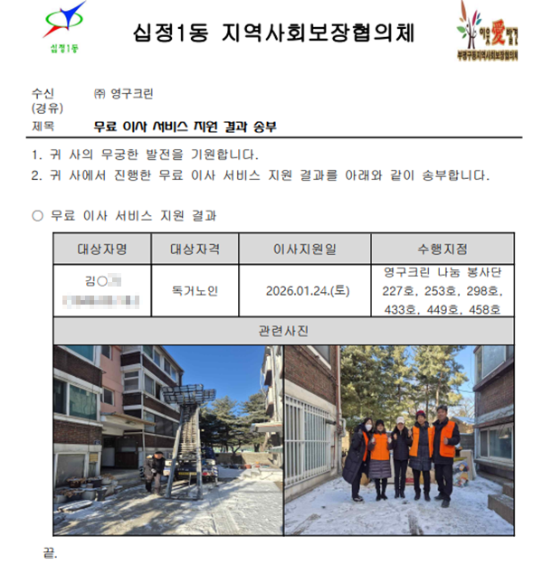 2026년 1월 24일 나눔봉사단 227호, 253호, 298호, 433호, 449호, 458호
