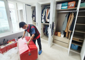 영구크린 전용차량, 유니폼 및 전용자재 사용, 바닥보강재 설치 완료, 아이스박스 청결 양호, 이중비닐 포장 및 에어캡 포장, 가전, 가구 커버포장 진행 등