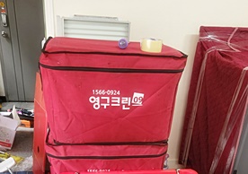 영구크린 전용차량, 유니폼 및 전용자재 사용, 바닥보강재 설치 완료, 아이스박스 청결 양호, 이중비닐 포장 및 에어캡 포장, 가전, 가구 커버포장 진행 등