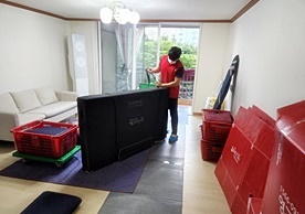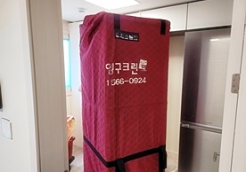 영구크린 전용차량, 유니폼 및 전용자재 사용, 바닥보강재 설치 완료, 아이스박스 청결 양호, 이중비닐 포장 및 에어캡 포장, 가전, 가구 커버포장 진행 등