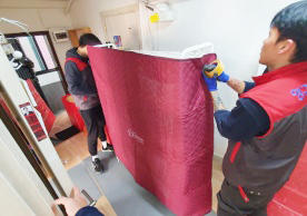 영구크린 전용차량, 유니폼 및 전용자재 사용, 바닥보강재 설치 완료, 아이스박스 청결 양호, 이중비닐 포장 및 에어캡 포장, 가전, 가구 커버포장 진행 등