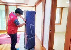 영구크린 전용차량, 유니폼 및 전용자재 사용, 바닥보강재 설치 완료, 아이스박스 청결 양호, 이중비닐 포장 및 에어캡 포장, 가전, 가구 커버포장 진행 등