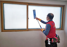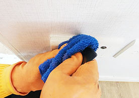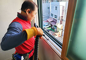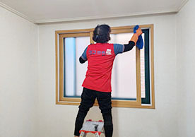 거실 가운데 청소장비 및 도구들을 잘 정리정돈 하여 청소를 진행하고 있었으며, 구석진 부분까지 꼼꼼하게 확인하는 모습이 인상깊었습니다.