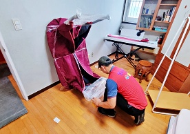 영구크린 전용차량, 유니폼 및 전용자재 사용, 바닥보강재 설치 완료, 아이스박스 청결 양호, 이중비닐 포장 및 에어캡 포장, 가전, 가구 커버포장 진행 등