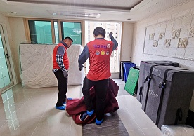영구크린 전용차량, 유니폼 및 전용자재 사용, 바닥보강재 설치 완료, 아이스박스 청결 양호, 이중비닐 포장 및 에어캡 포장, 가전, 가구 커버포장 진행 등