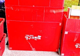 영구크린 전용차량, 유니폼 및 전용자재 사용, 바닥보강재 설치 완료, 아이스박스 청결 양호, 이중비닐 포장 및 에어캡 포장, 가전, 가구 커버포장 진행 등