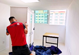 영구크린 전용차량, 유니폼 및 전용자재 사용, 바닥보강재 설치 완료, 아이스박스 청결 양호, 이중비닐 포장 및 에어캡 포장, 가전, 가구 커버포장 진행 등