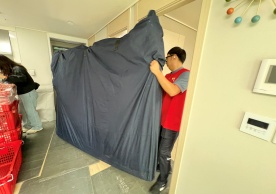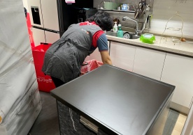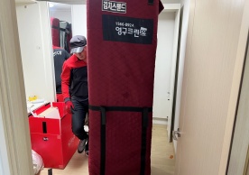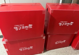 영구크린 전용차량, 유니폼 및 전용자재 사용, 바닥보강재 설치 완료, 아이스박스 청결 양호, 이중비닐 포장 및 에어캡 포장, 가전, 가구 커버포장 진행 등