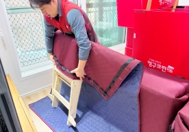 영구크린 전용차량, 유니폼 및 전용자재 사용, 바닥보강재 설치 완료, 아이스박스 청결 양호, 이중비닐 포장 및 에어캡 포장, 가전, 가구 커버포장 진행 등