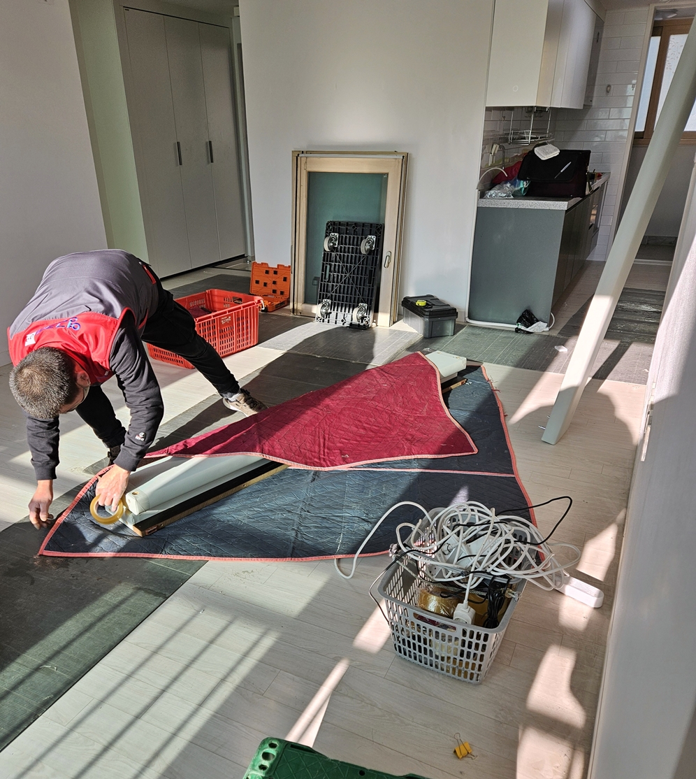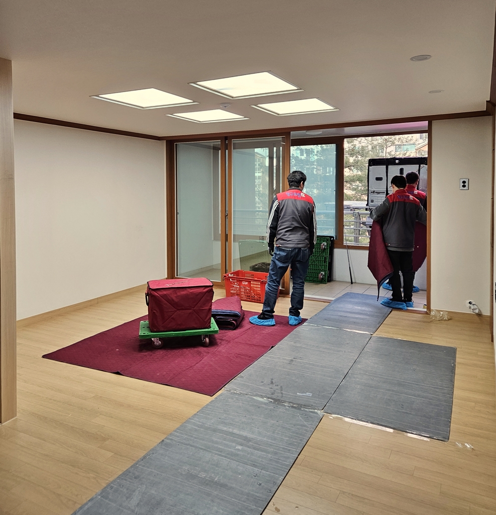 점심식사를 하고 오신 235호점 팀원분들은 덧신을 착용하시고 바닥 보호 자재를 깔고 이사를 시작하셨어요.