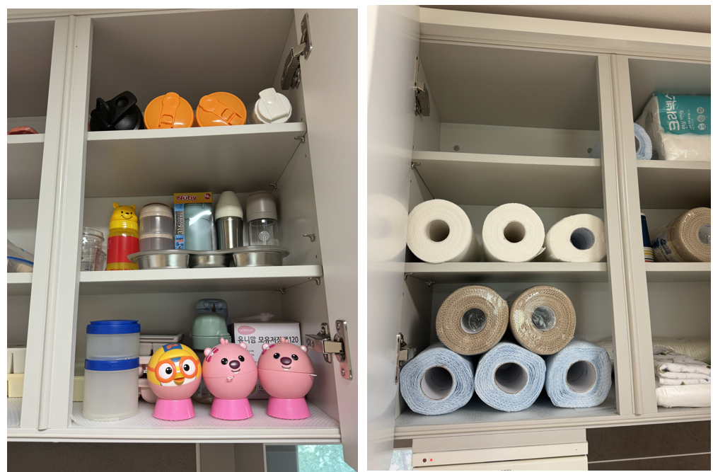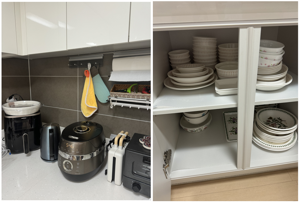 - 주방 정리 : 잘 포장된 주방 용품을 하나씩 분류하여 정리해주셨습니다.