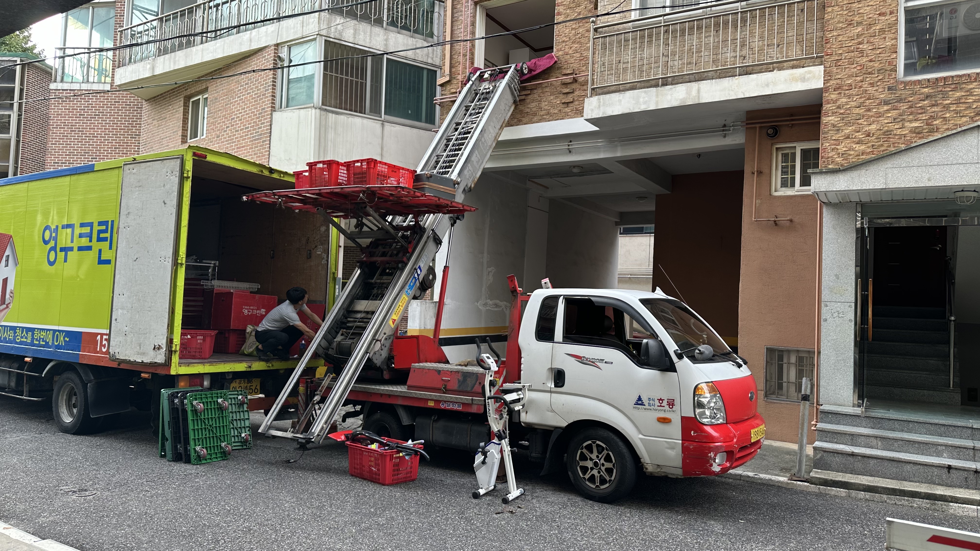 정리해 주시는 이모님 1명, 남자 3명, 사다리차 남자 1명