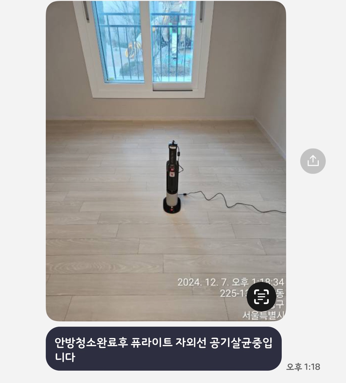 연무살균소독, 자외선 소독까지 잊지 않고 해주셔서 끝나고 청소 세제 냄새라던가 독한 냄새 하나 없이 너무 말끔하게 마무리 되었습니다!!