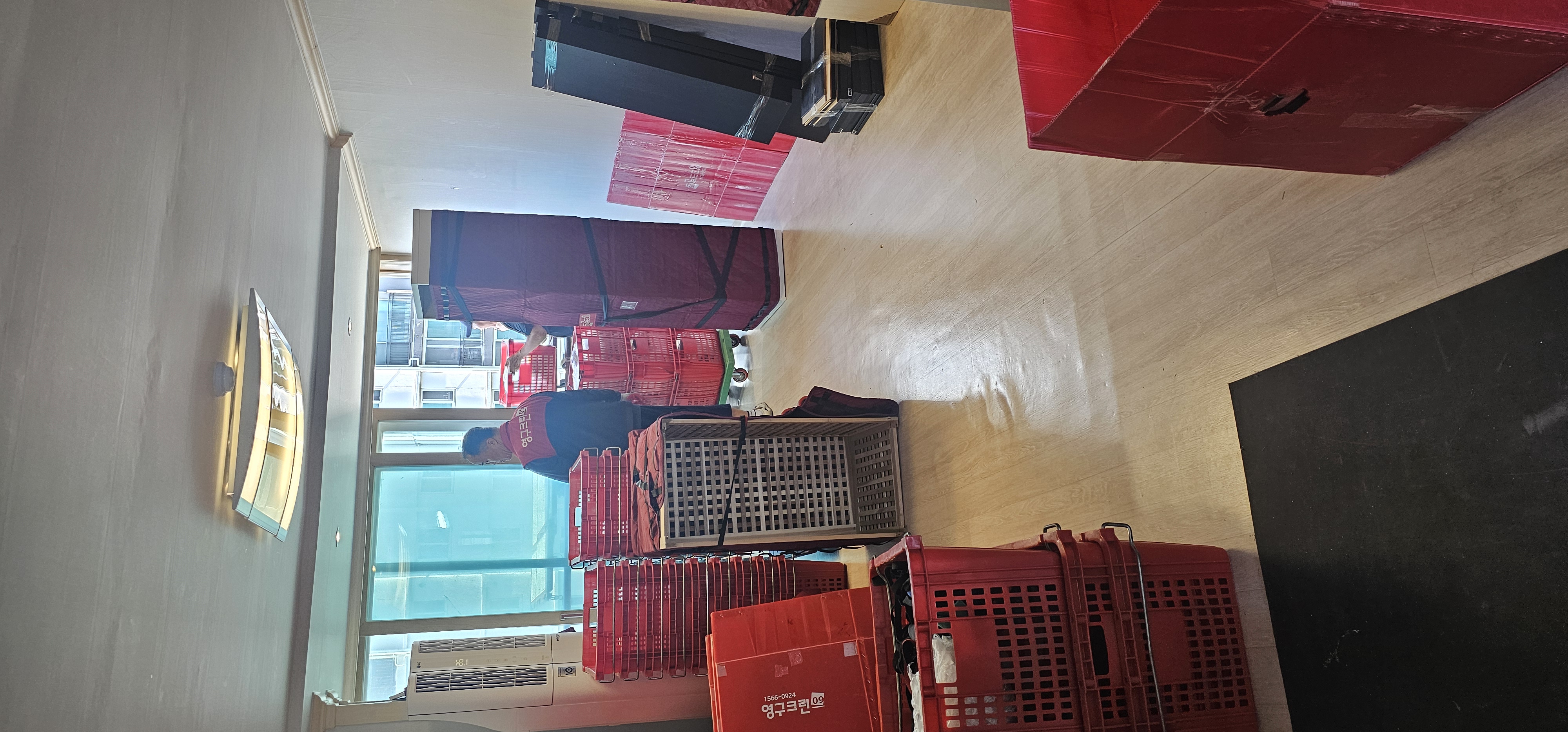 현관과 복도까지 깔끔하게 준비된 이삿짐들.매트, 담요, 보호패드, 운반 박스까지…