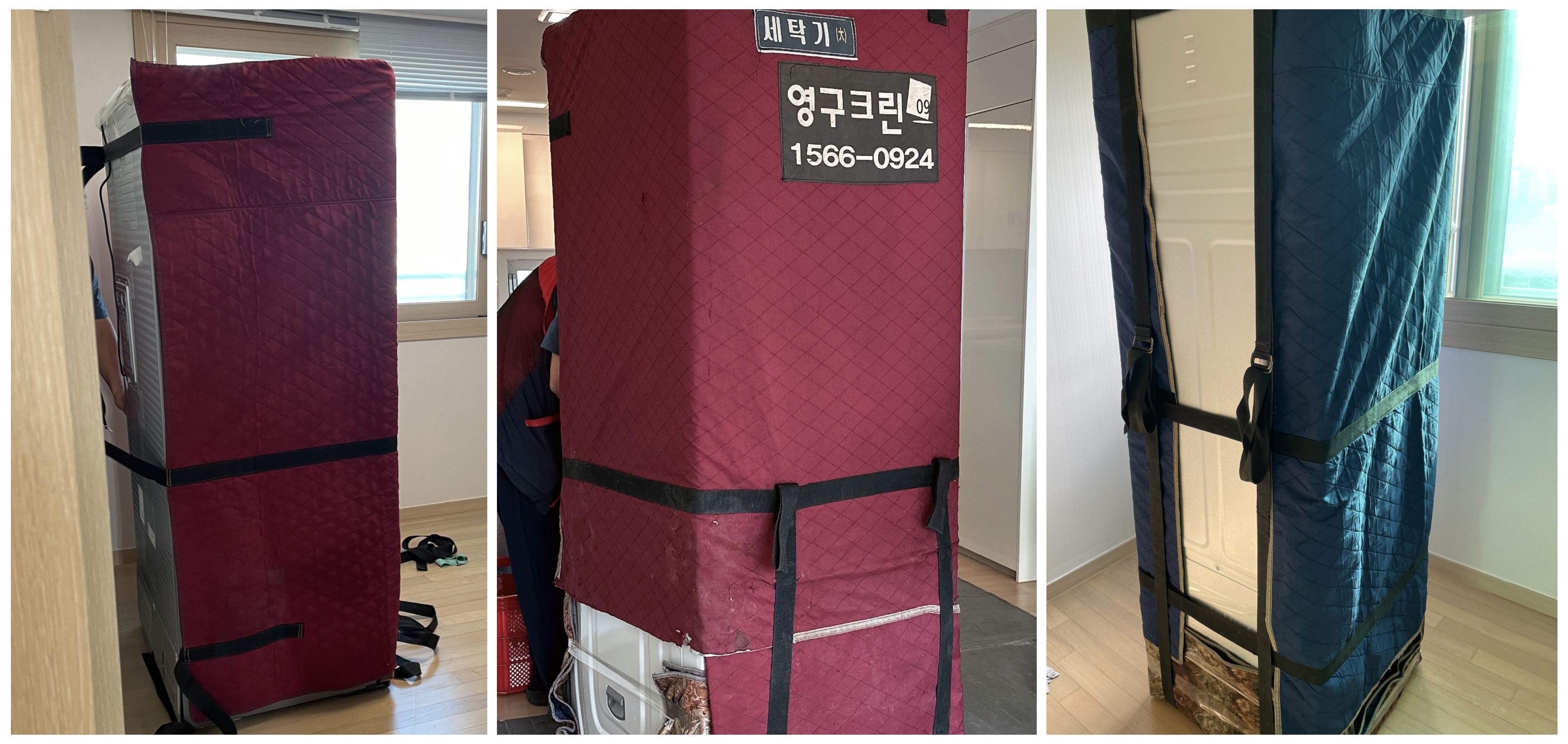 포장 작업이 시작되었고, 크기가 큰 냉장고, 워시타워, 에어드레서를 안전하게 포장해 주십니다.