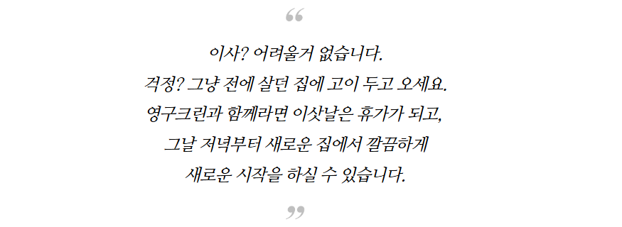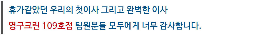 새로운 곳에서의 새출발을 영구이사로 선택해서 완벽한 시간을 선물받은거 같아서, 영구이사 109호점 팀원분들께 다시한번 감사하다고 말씀드리고 싶네요.
